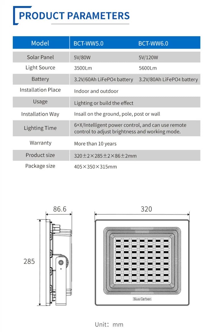 Tóm lại: "Đèn Blue Carbon 5.0" là một mẫu đèn pha (hoặc đèn đường) năng lượng mặt trời cao cấp, nổi bật với pin LiFePO4 dung lượng lớn và chip LED Cree chất lượng cao, mang lại khả năng chiếu sáng bền bỉ, liên tục ngay cả trong những ngày thiếu nắng.